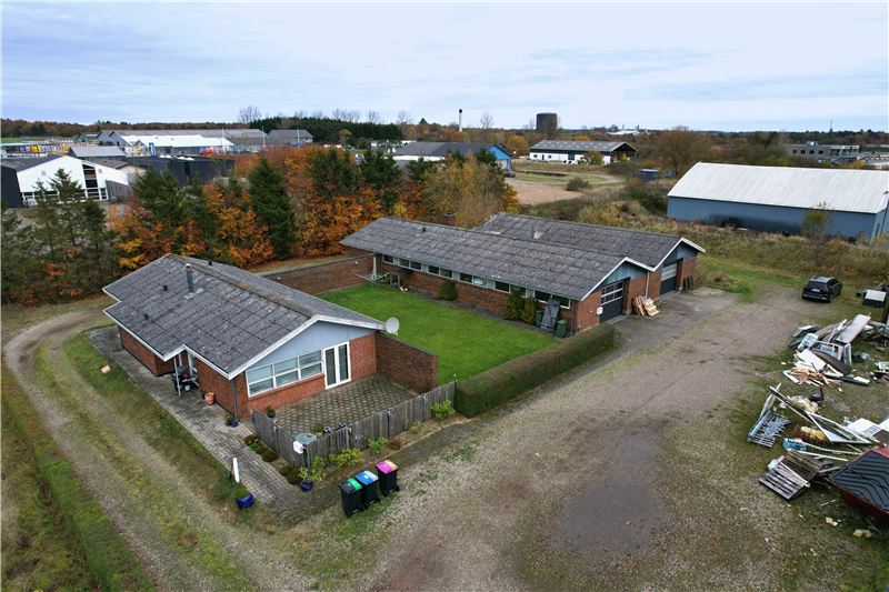 Huset har egen indkørsel og er adskilt fra erhvervsbygningerne af en lukket og afskærmet have, hvilket giver en naturlig adskillelse mellem bolig og erhverv.